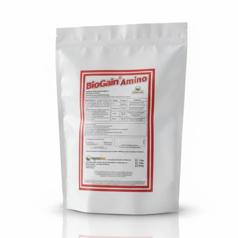 BioGain Amino é um fertilizante organomineral em pó destinado à aplicação foliar, formulado com 17% de Nitrogênio proveniente de 17 diferentes tipos de aminoácidos.